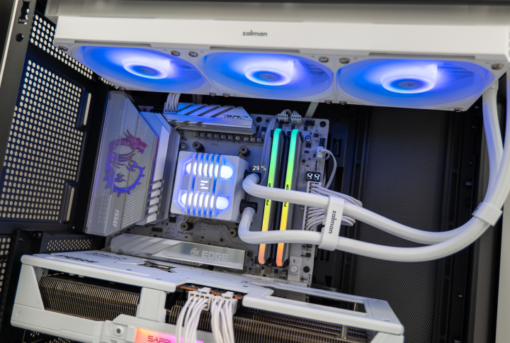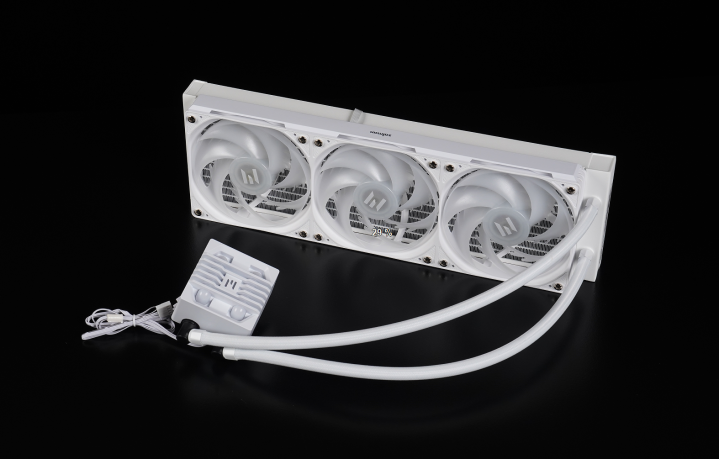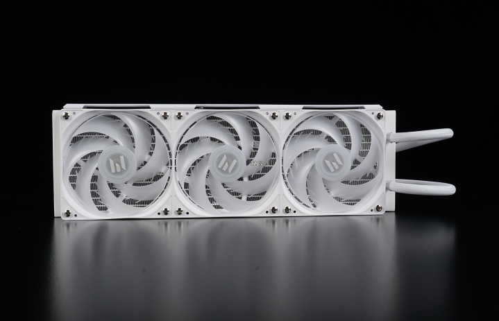 外观方面,这款散热器堪称“白色主题装机神器”。冷排采用全白涂层设计,表面处理细腻,没有明显的毛刺感,搭配同色系的水冷管,整体视觉统一性极强。水冷管采用编织网包裹,不仅提升了美观度,还能有效保护水管,避免使用过程中出现磨损。水冷头设计颇具特色,正面印有ZALMAN的品牌LOGO,支持RGB灯光效果,灯光颜色均匀柔和,可通过主板同步软件实现多种灯光模式切换,无论是静态展示还是动态流转,都能为机箱内部增添十足的氛围感。